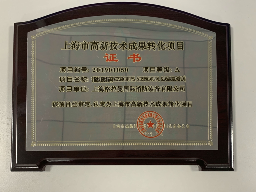 上海格拉曼公司新产品-干粉泡沫联用消防车(SGX5320GXFGP55等三种车型)首次荣获上海市高新技术成果转化项目证书。
