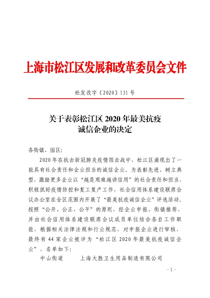 2020年在抗击新冠肺炎疫情阻击战中,松江区涌现出了一批具有社会责任和企业担当的诚信企业,为表彰先进、树立典型,激励更多企业以“越是艰难越讲信用”的社会责任和担当,积极抓好疫情防控和复工复产工作,社会信用体系建设联席会议办公室在全区范围内开展了“最美抗疫诚信企业”评选活动,按照“公开、公正、公平”的原则,经企业申报、街镇推荐,并由社会信用体系建设联席会议成员单位结合各自工作职能,根据相关法律法规和行业规范,对申报企业进行审核,最终有44家企业被评为“松江区2020年最美抗疫诚信企业”,其中格拉曼公司成功入选。