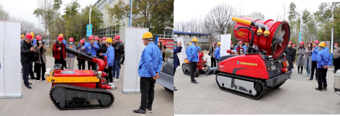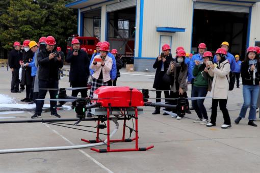 启动仪式后,协会领导、政府领导及各行业媒体记者一行至海伦哲公司宝莲寺路厂区和螺山路厂区,参观了公司展厅、厂区、车阵、 民品消防车生产线以及国产绝缘臂生产车间,公司专门展示了中华第一车—华灯检修车、大高度智能化复杂臂高空作业车、AMR(HAS40) 自动导引车、应急排水机器人、大功率发电车并机并网、防爆灭火侦 查机器人等多款代表公司技术先进水平、代表公司新质生产力的拳头 产品,并重磅推出演示了公司最新研制的高空系留无人机灭火消防车, 该车是公司研制开发的首台可携带 DN40 消防水带,喷射 A/B 类泡沫灭火剂扑救150 米(国内领先国际先进),高空建筑火灾产品,在厂区内做现场演示,将系留无人机升至 150 米高空进行持续喷射泡沫灭 火剂演示,将无人机悬停至厂房高度做泡沫液挂壁和出水演示,现场演示效果非常震撼,受到在场人员的一致赞叹与好评。该高空系留无 人机灭火消防车致力于攻克 100 米以上高空灭火这一世界难题;该车的载液量目前在国内外相似产品中处于领先地位,车辆配有发电装置为无人机提供动能,可长时间进行空中作业,车前端设置有飞控舱指挥,舱顶部和周边安装有防弹玻璃,确保飞手的飞控安全,灭火系统也是针对无人机灭火专门研制。