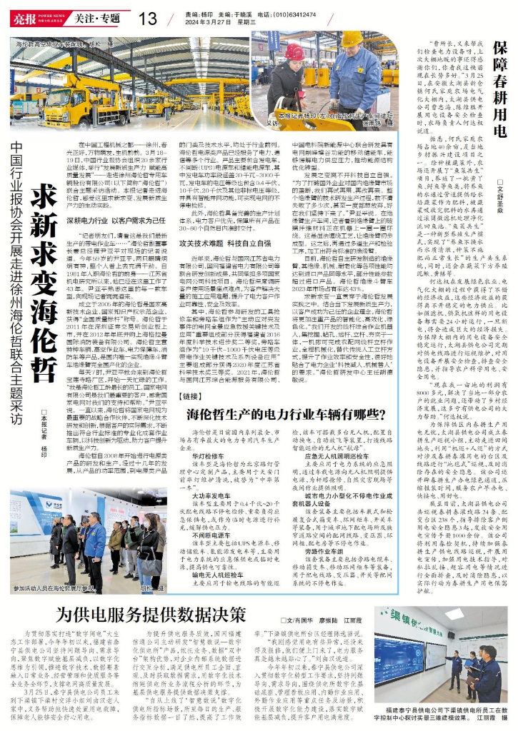 2024年3月27日,亮报刊载文章《求新求变海伦哲》,报道了公司深耕电力行业,攻关技术难题,以客户需求为己任,走科技自立自强之路。