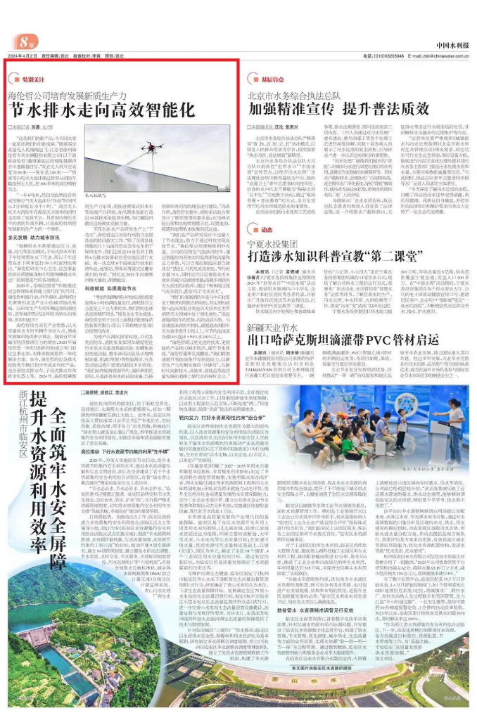 2024年4月2日,中国水利报刊载文章《海伦哲公司培育发展新质生产力,节水排水走向高效智能化》,报道了公司多元发展助力城市防汛,科技赋能实现高效节水,以新质生产力吹响发展的“冲锋号”,在新时代高新技术、高效率、高效益等高质量发展的道路上做行业的标杆企业。
