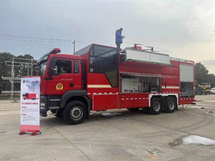 该车主要应对城市高层及超高层建筑火灾,兼顾供电、照明、救援、灾情侦查等辅助功能。整车模块化设计,设有飞控舱保障飞手安全,智能化程度高,灭火展开时间在5分钟左右。车辆采用智能化灭火设备操作便捷,配备独立发动机驱动的微细结构泡沫CAFS灭火系统,适应1%~6%的A/B类泡沫液灭火;配备系留无人机,使用DN40水带,灭火高度达155m,通过系留箱供电可长时间进行空中灭火作业。